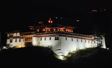 The Tashichho Dzong, also known as "The Fortress of the Glorious Religion,this remarkable structure has been the seat of Bhutan's government and houses the throne room and offices of the king, along with the central monastic body.